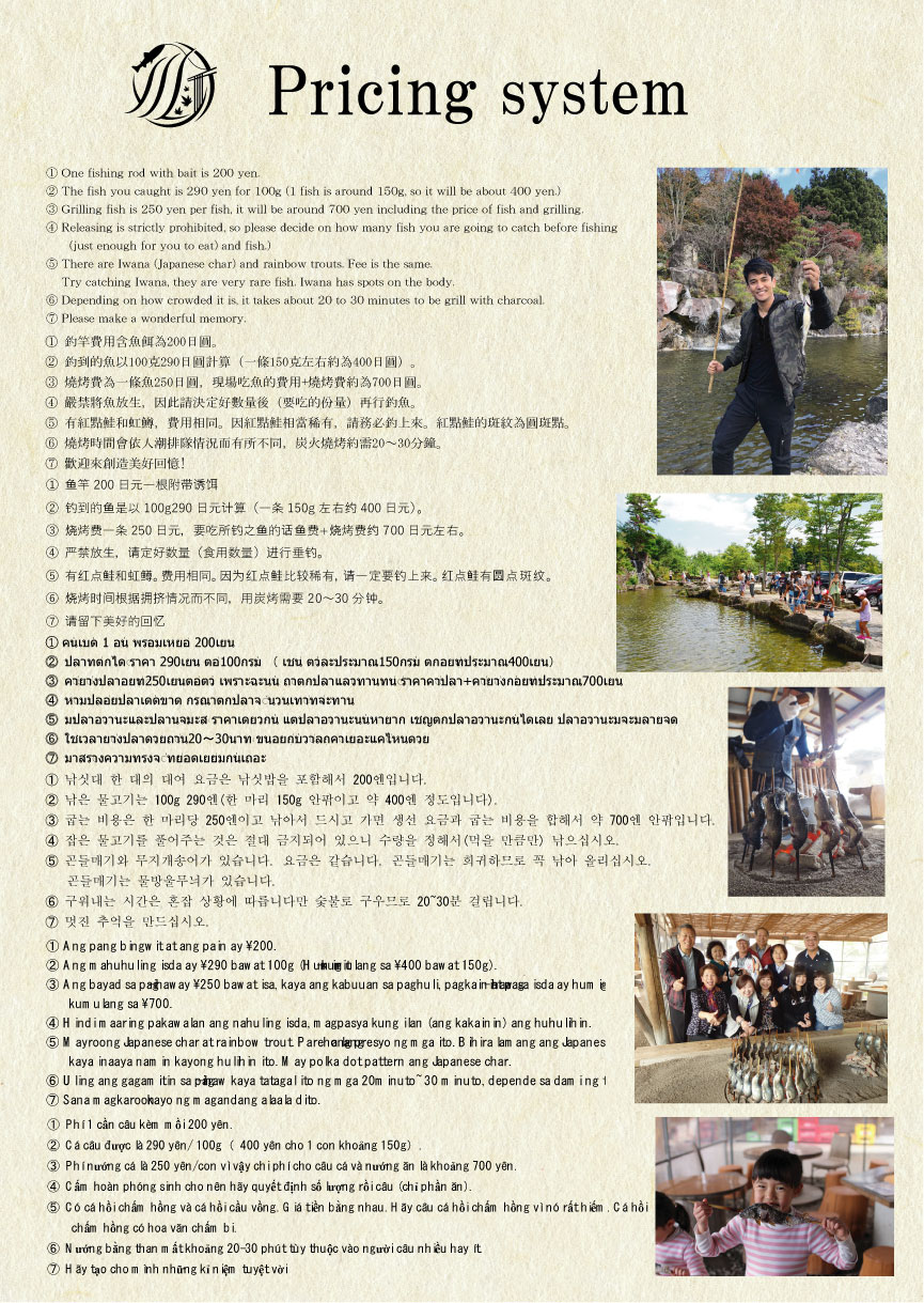 ![]() Nasukogen Seiryunosato ![]() イワナとニジマスが入っています Our fishing pond is filled with rainbow trout and Iwana (Char). While Iwana is a more expensive fish, the same prices apply. Iwana flesh is firmer, and has a wonderful flavor. The spotted fish are Iwana. Try to aim for them. 本店的釣魚池有虹鱒和岩魚兩種類的魚。岩魚相對較高級但價錢相同。岩魚的魚肉緊緻,美味可口。有圓點花紋的即為岩魚,不要錯過喲。 本店的钓鱼池里有虹鳟和红点鲑两种。红点鲑相对较高级,但是价钱是一样的。红点鲑的鱼肉紧致,美味可口。有圆点花纹的是红点鲑,不要错过哟。 저희 낚시터에는 무지개송어와 곤들매기 2종류가 있습니다. 곤들매기가 더 고급 생선이지만 이용요금은 동일합니다. 드실 때도 곤들매기가 살이 쫀득하며 더 맛있습니다. 물방울무늬가 있는 것이 곤들매기이므로 잘 노려서 낚시를 즐기시기 바랍니다. Có 2 loại cá là cá hồi có đốm đen và cá hồi chấm hồng ở trong ao câu cá ở cửa itt chúng tôi. Cá hồi chấm hồng là loại cá thượng hạng hơn nhưng về giá thì giống nhau. Thịt cá hồi chấm hồng cũng chắc và ăn ngon hơn. Hãy nhắm và câu loại cá có màu chấm bi vì đó là cá hồi chấm hồng. บ่อตกปลาของเรามีปลานิจิมะสึและปลาอิวะนะสองชนิดปลาอิวะนะเป็นปลาที่มีราคาแพงกว่าแต่ราคาเท่ากัน เนื้อปลาอิวะนะจะแน่นและอร่อยกว่า ปลาอิวะนะจะมีลายเป็นจุด เพราะฉะนั้นเล็งแล้วตกปลาให้ดี Ang aming palaisdaan ay may dalawang uri ng isda tulad ng Rainbow Trout